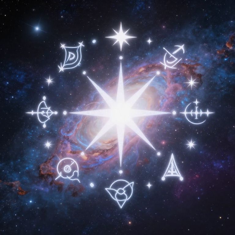 Digital artwork of a radiant starburst in space, surrounded by white astrological symbols, set against a colorful nebula backdrop.