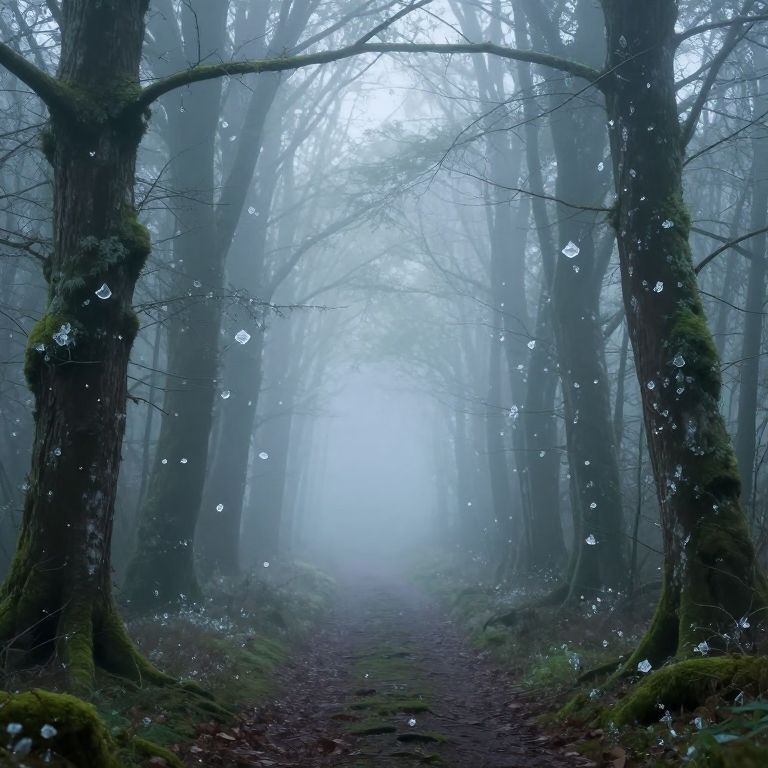 Photograph of a misty forest path. Tall, moss-covered trees with dark, textured bark stand on either side, creating a narrow, ethereal tunnel. Bare branches stretch upwards, while droplets of water or ice float in the air. The path, lined with damp, dark brown leaves, leads into a dense, foggy background, creating a sense of depth and mystery. The overall color palette is cool and muted, with blues, greens, and grays dominating. The atmosphere is serene and slightly haunting, with soft, diffused light filtering through the fog.