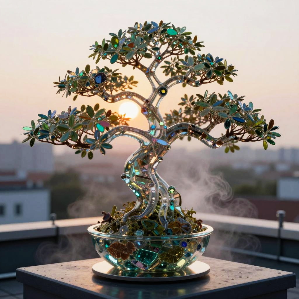 Sentient glass bonsai tree | rooftop neon mist at dawn, art nouveau cyber-futurism, ultra-realistic glass-shader render with microscopic surface detail, cinematic rim lighting and shallow depth of field, inspired by Gustav Klimt
