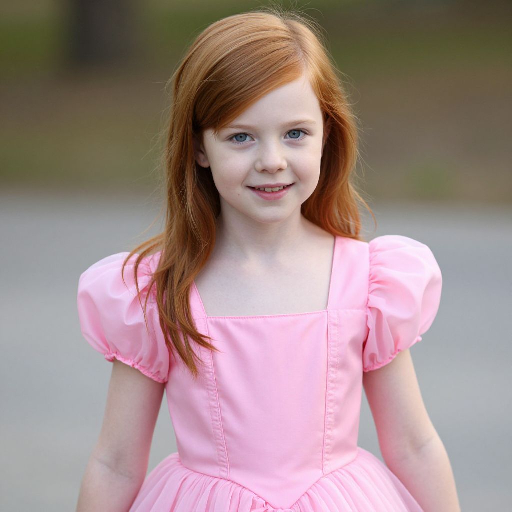 Ariel Pink Dress Costume, a close up of a young girl with red hair wearing a pink dress