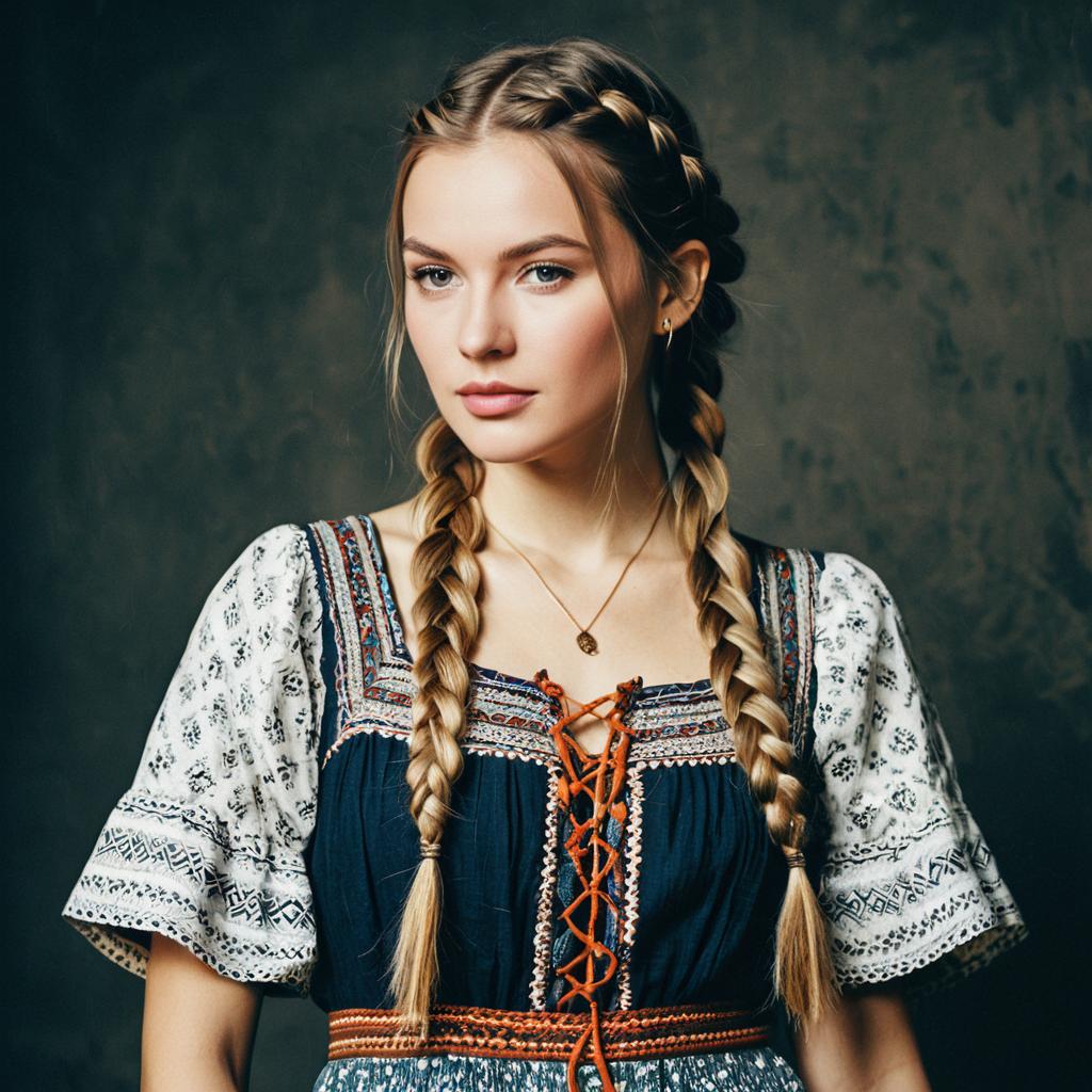 Dutch Braids hairstyle on female model, wearing bohemian dress, in photo studio, captured in fashion editorial style with soft highlights.