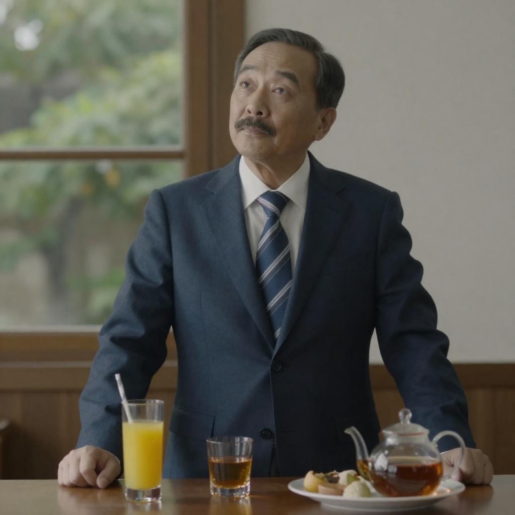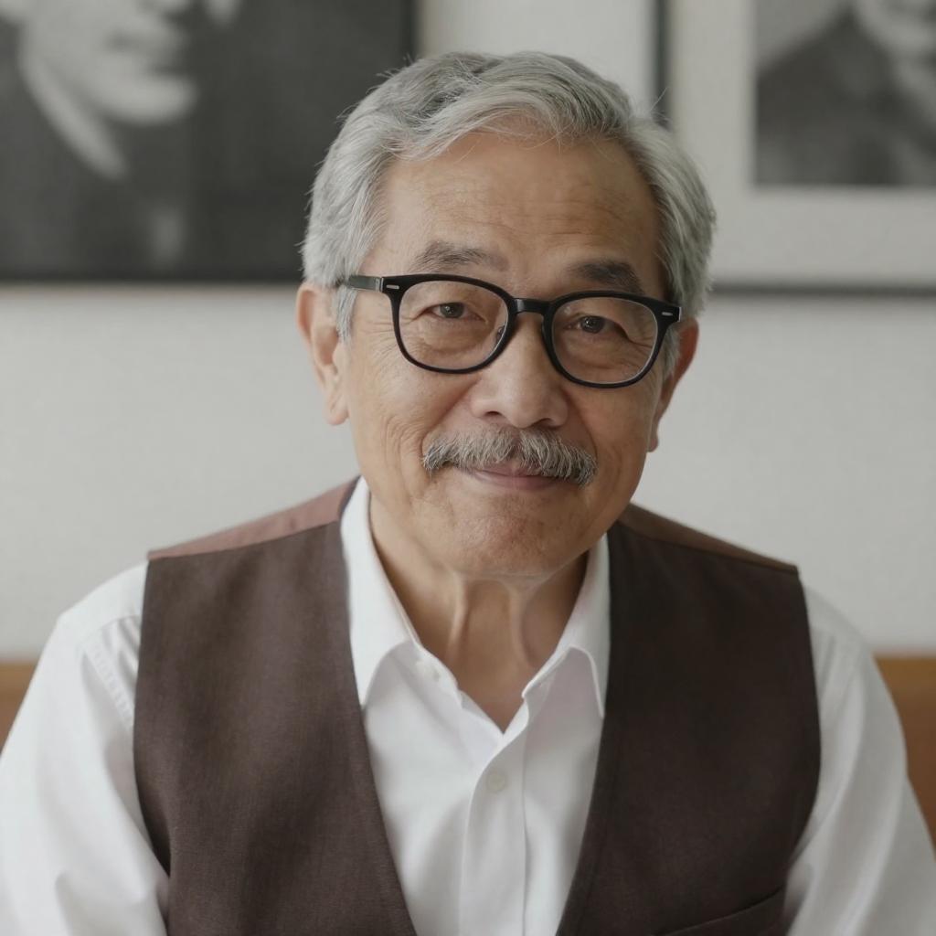 Photograph of an older man with gray hair, a mustache, and round, reflective glasses. He wears a black coat, white shirt, and striped tie. The background is a blurred, indoor setting with a greenish hue. His expression is serious and focused.