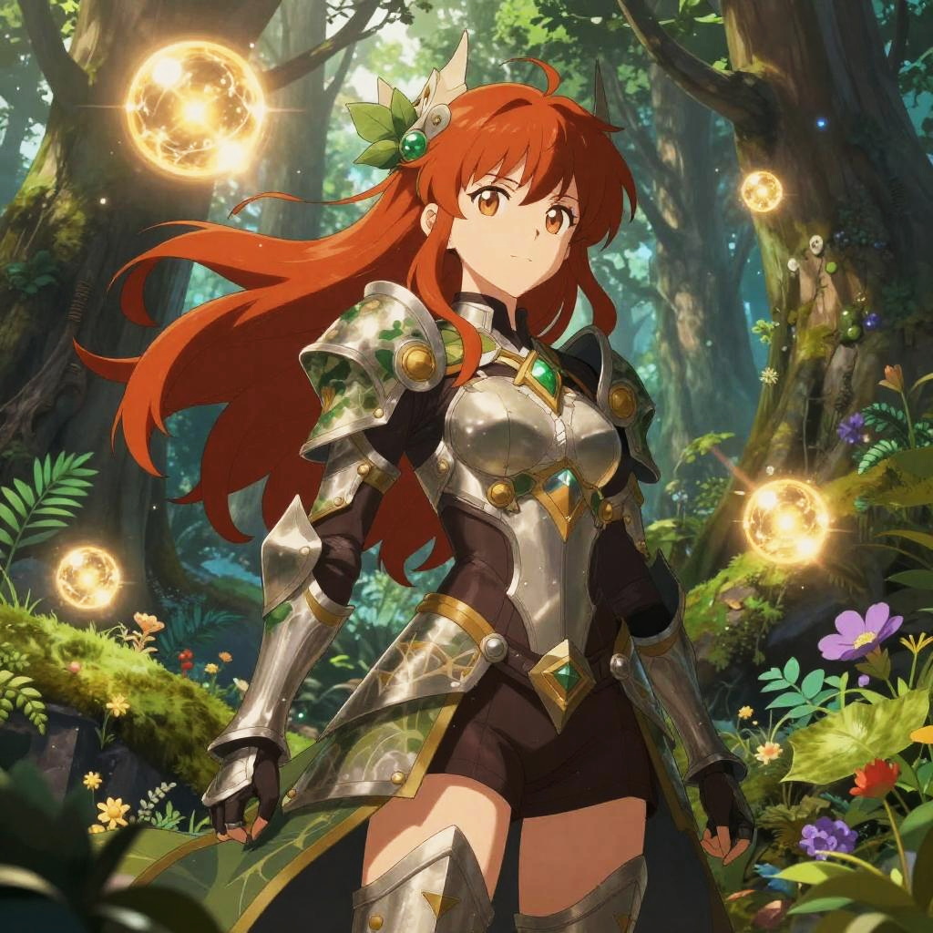 Anime red hair girl in a mystical enchanted forest, glowing magical orbs floating around, detailed intricate fantasy armor mixed with nature elements, confident and serene expression, vivid and lush environment with detailed flora and fauna, epic storybook illustration.