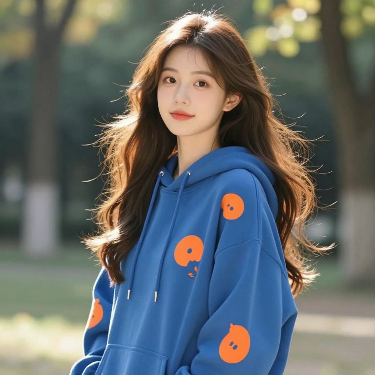 Photograph of an Asian woman with long black hair, wearing a red heart-embroidered sweater, standing in a brightly lit store with pink and