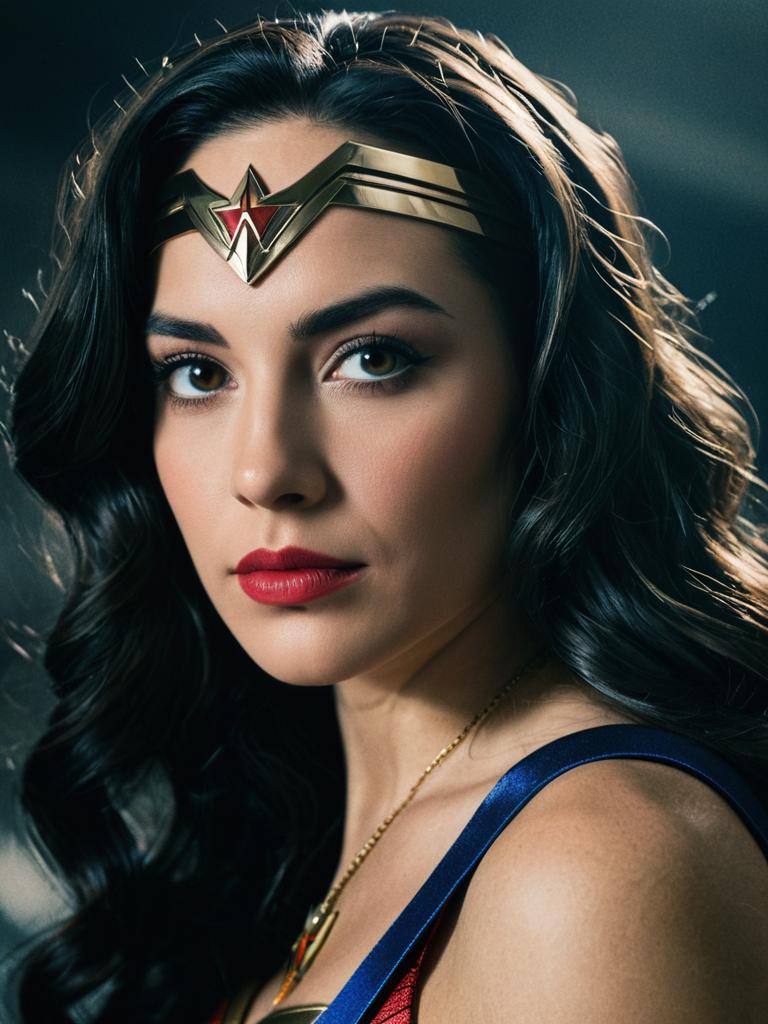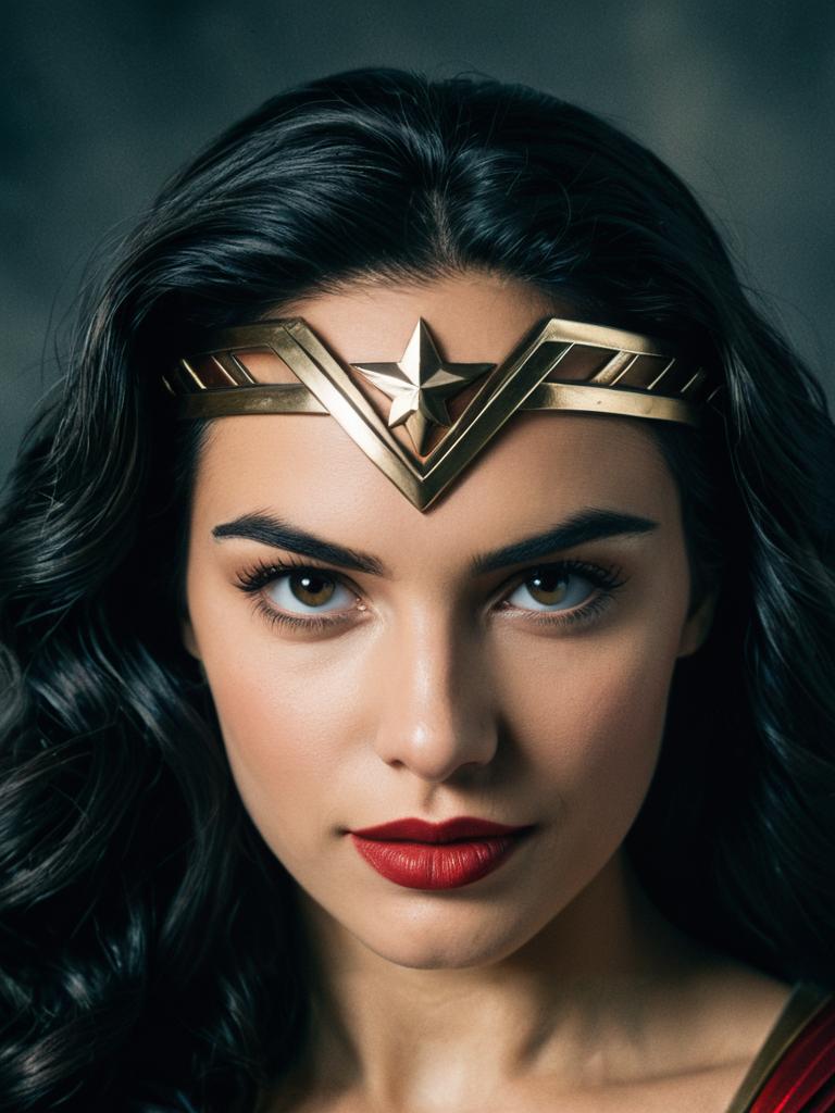 Woman in Wonder Woman costume, close-up detailed headshot with tiara