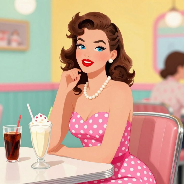 Digital illustration of a 1950s-style diner scene. A fair-skinned woman with wavy brown hair and bright blue eyes wears a strapless pink polka dot dress, pearl necklace, and red lipstick. She sits at a pink, retro-style booth, resting her chin on her hand. On the white table in front of her are a milkshake with whipped cream and a cherry, and a glass of dark soda with a straw. The background features pastel green and yellow walls, a blurred figure of another person, and a framed picture. The overall style is vibrant and nostalgic, reminiscent of mid-20th-century pin-up art.