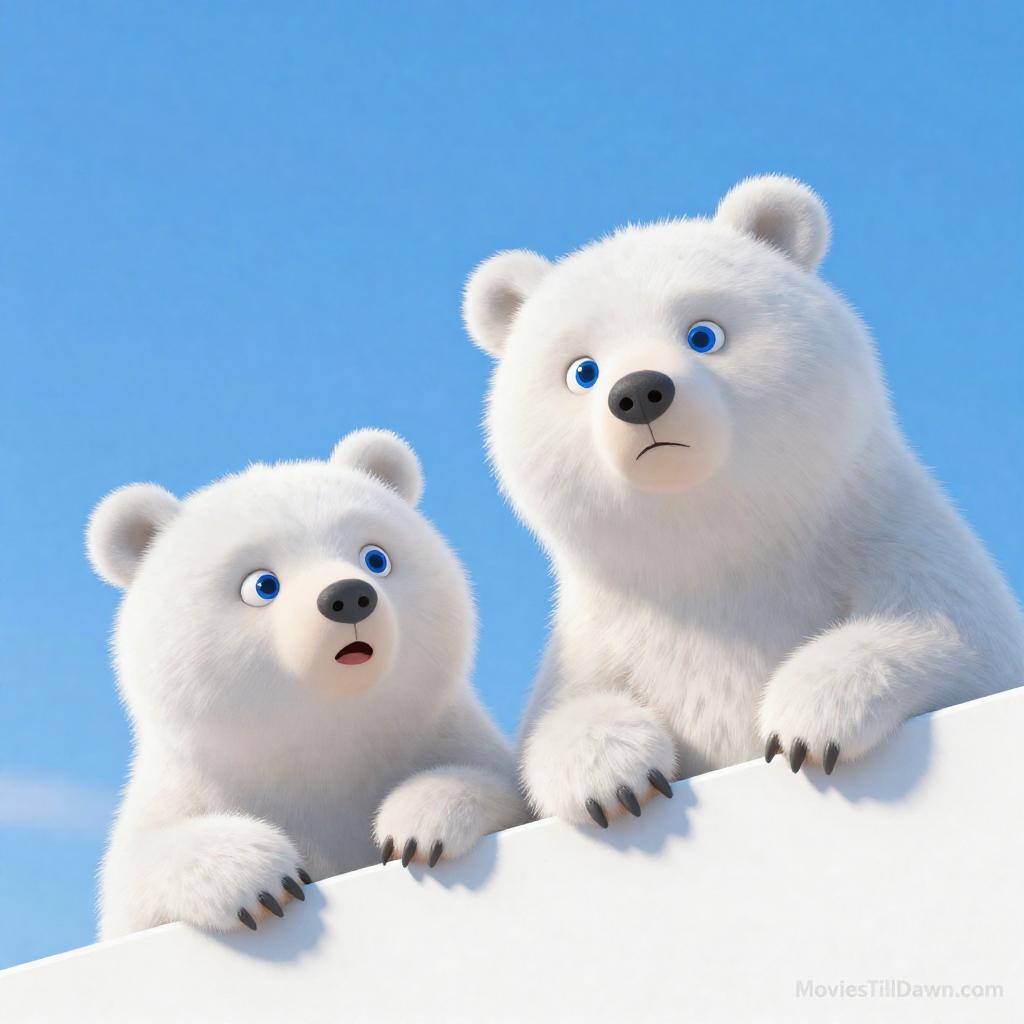 Digital drawing of two cartoon bears with white fur and blue eyes. The smaller bear on the left looks surprised, while the larger bear on the right has a concerned expression. They are peeking over a bright blue and white diagonal slope. The background is a solid blue. The artist's "MoviesTillDawn.com" is in the bottom right corner.