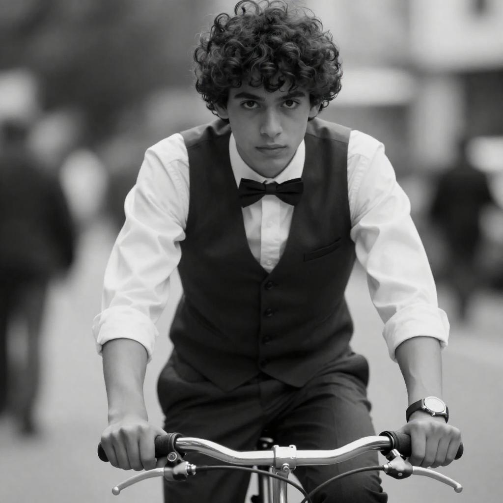 Black-and-white photograph of a man with curly hair riding a bicycle on the left, and a close-up of the same man smiling on the right. He wears a jacket over a collared shirt. Background includes a blurred fence.