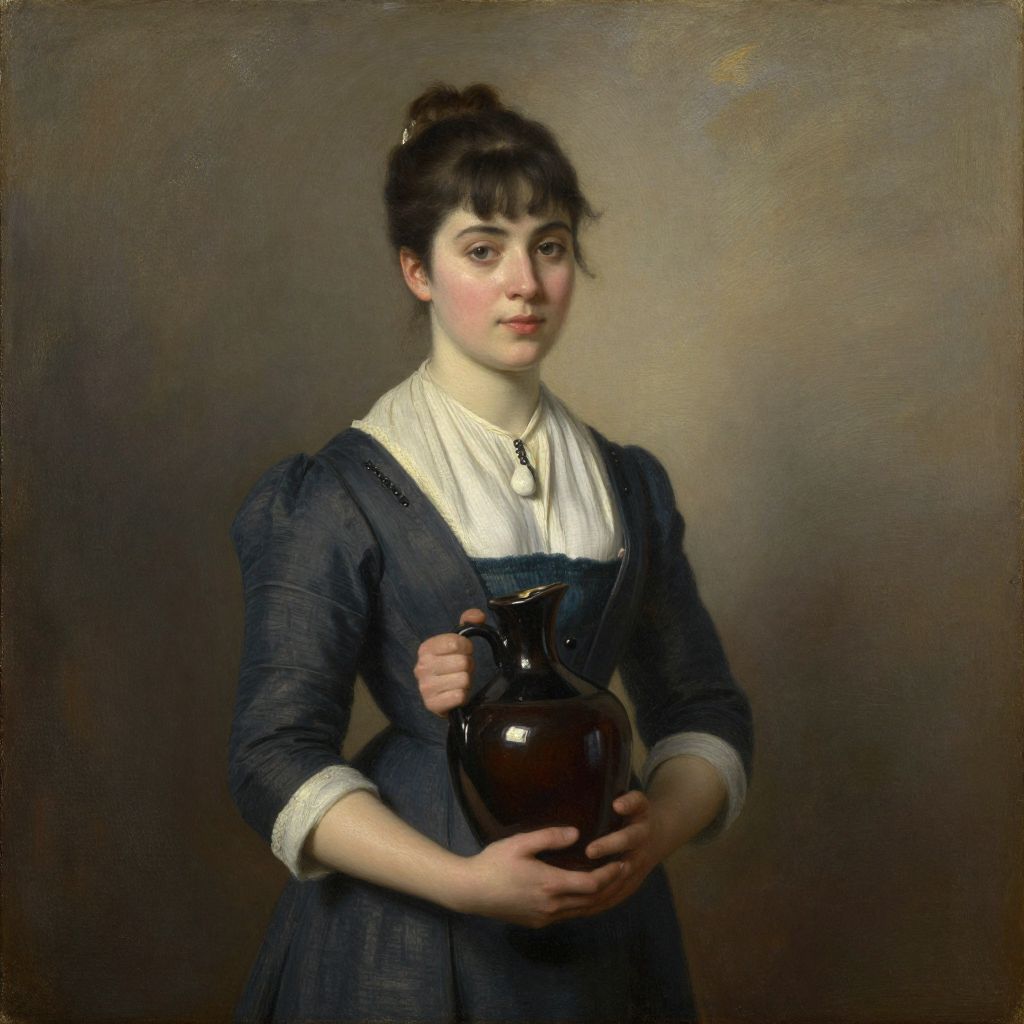 A classical-style oil painting reminiscent of Camille Corot, depicting a woman in period attire holding a dark ceramic jug, set against a muted background with subtle lighting effects, evoking a vintage and timeless aesthetic.