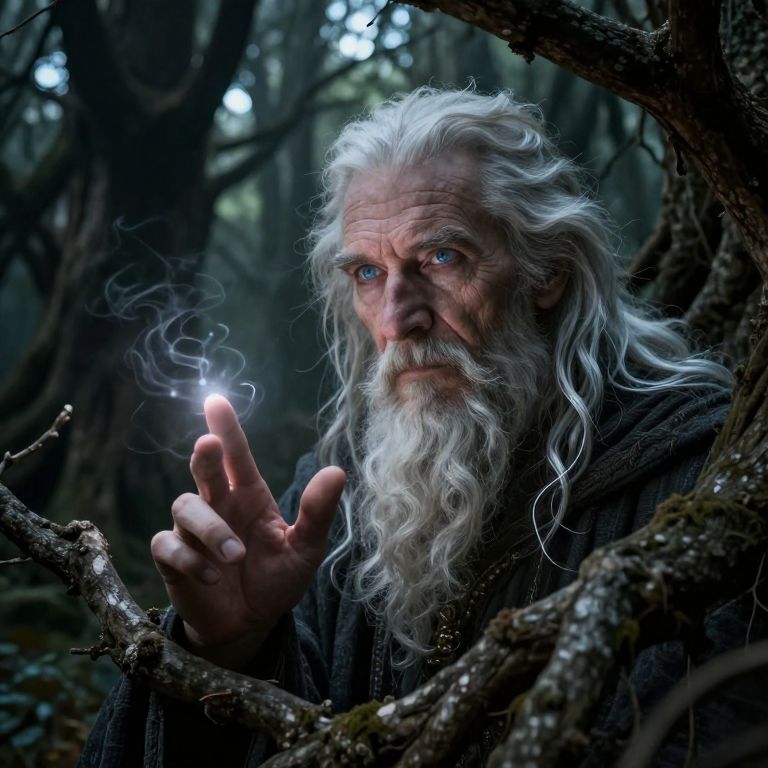 Imagine an ultra-realistic portrait of a wise, ancient sorcerer. He has gentle blue eyes and flowing white hair, interwoven with strands of silver. The sorcerer is set against the backdrop of a mystical forest, with chiaroscuro lighting creating deep shadows that play across his craggy face. The unique 'bug's-eye view' perspective peers up at the sorcerer through the gnarled roots and twisted branches of ancient trees. Emphasize the connection between nature and magic with ethereal wisps of light dancing around his fingertips. Capture a sense of mystery, wisdom, and a hint of impending danger in the sorcerer's gaze, inviting viewers to explore the enigmatic world of this powerful figure.