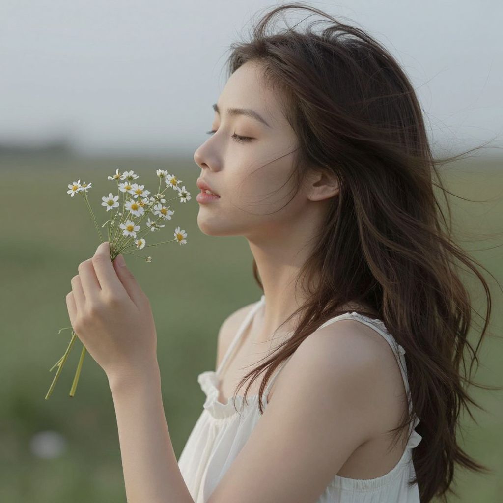 Photograph of a serene young woman with long brown hair, wearing a light gray linen blouse, holding white daisies, standing in a green,