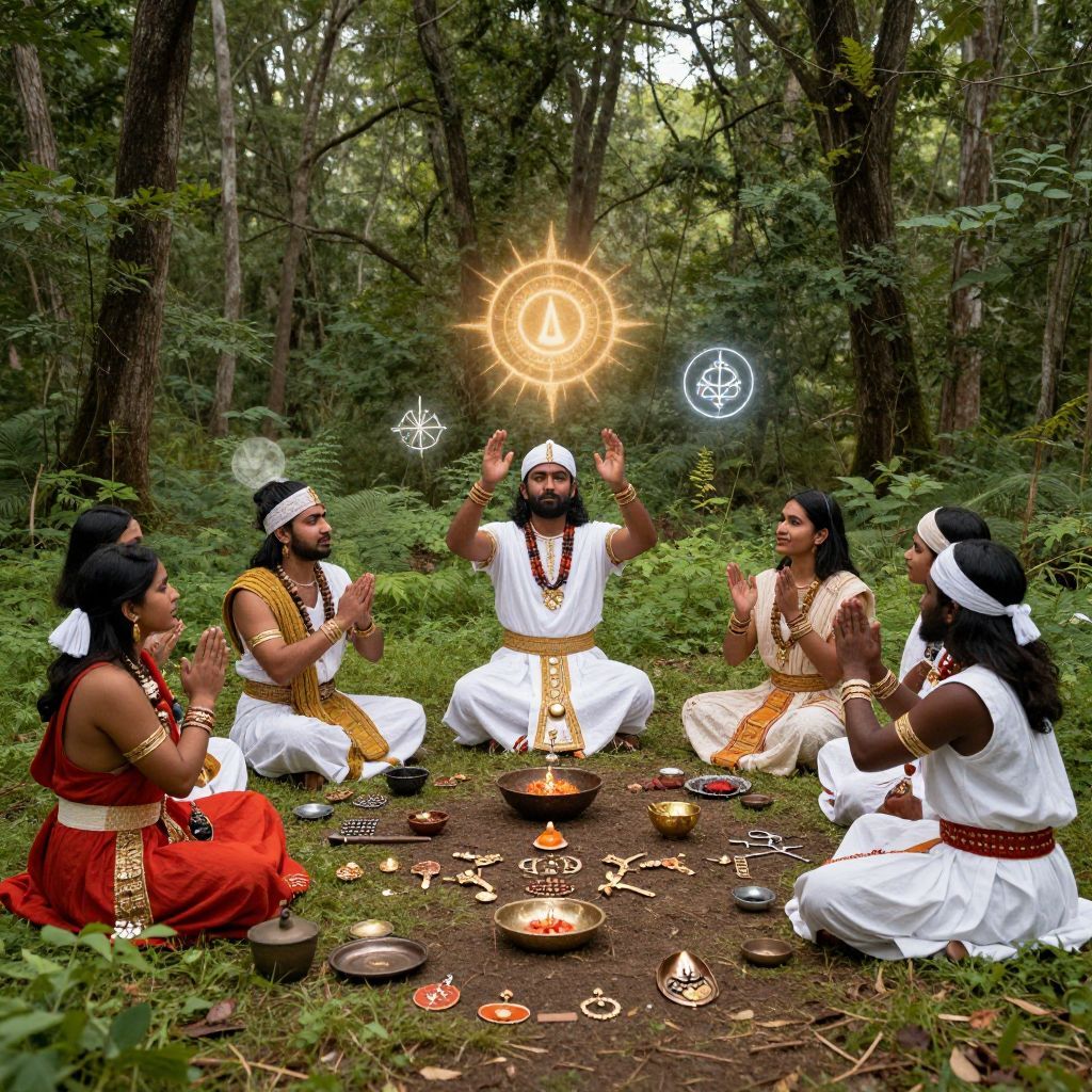 Ancient Aryans performing a sacred ritual in a lush forest clearing, surrounded by nature and traditional symbols, vibrant colors with ethereal lighting, capturing the spiritual and mystical aspects of early Indo-European cultures with detailed costumes and artifacts.