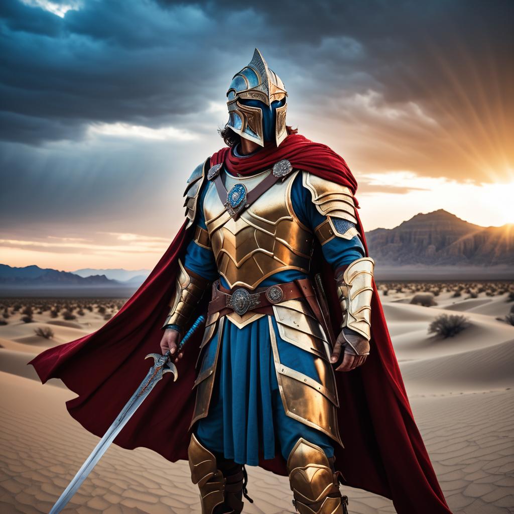 Heroic Warrior in Ancient Armor at Desert Sunset