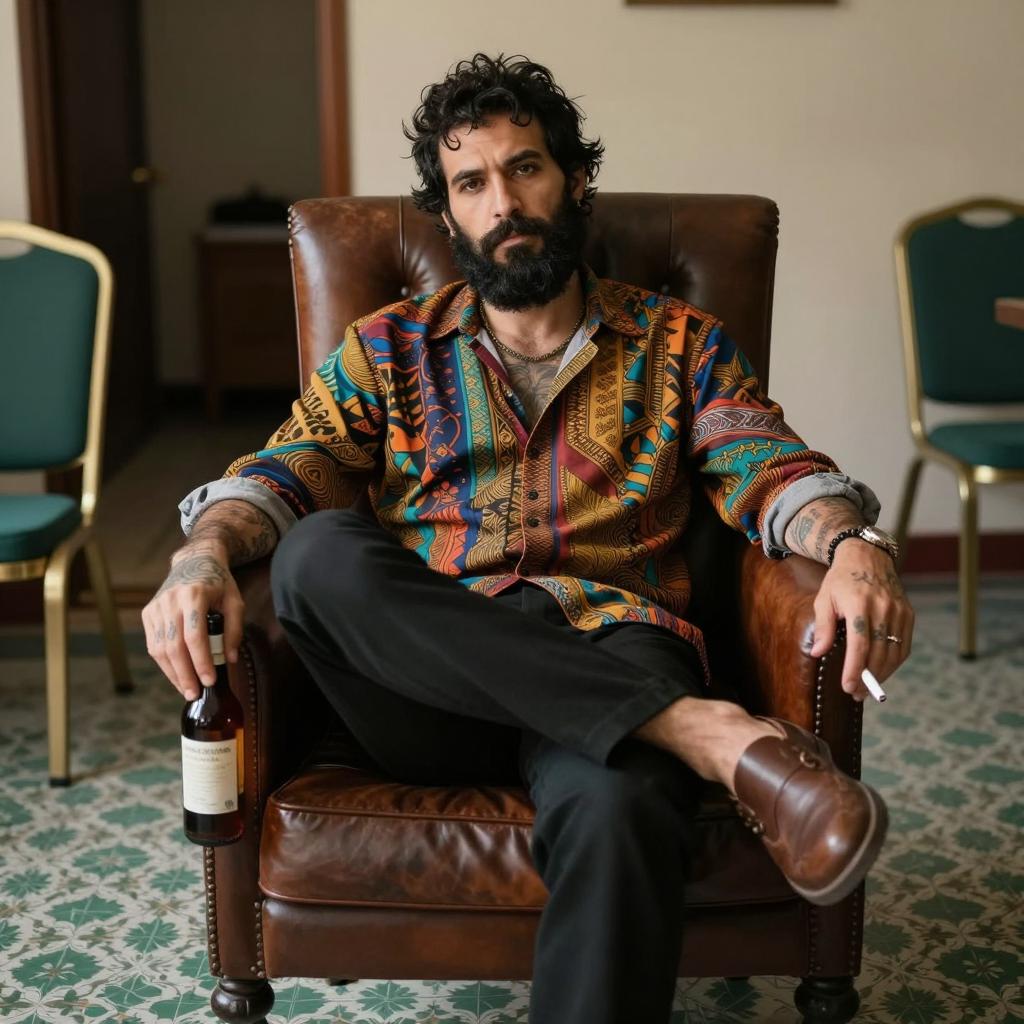 A man with dark hair, beard, and tattoos sits in a brown leather chair, holding a bottle in his right hand and a cigarette in his left. He wears a colorful, patterned shirt and black pants. The background has a beige wall, a doorway, and green chairs on a green patterned floor.