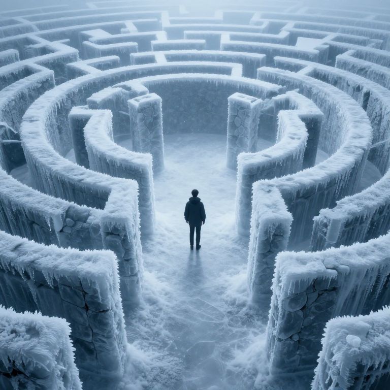 A solitary figure stands at the center of a hauntingly symmetrical labyrinth crafted from frost-covered stone pillars, their icy surfaces shimmering under ethereal, diffused lighting, evoking a surreal, otherworldly atmosphere reminiscent of a digital art rendering.