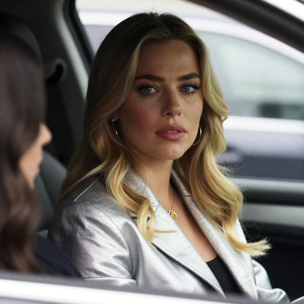 Blonde woman with wavy hair, pink jacket, black skirt, beige bag, holding gun, making peace sign, standing in front of green and brown classic cars, police officer in background, urban street setting.