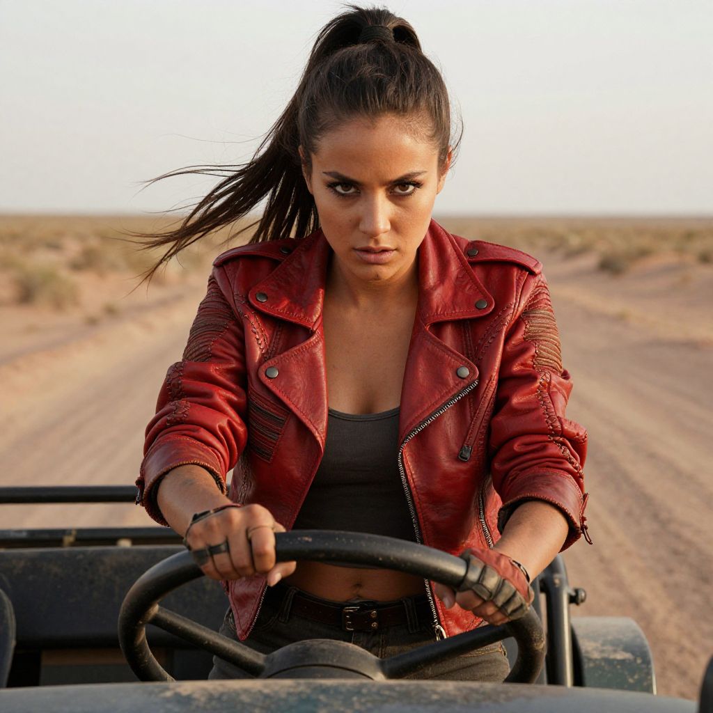 Photograph of a fierce, dark-haired woman with a high ponytail, wearing a red, leather jacket with silver zippers over a black tank top. She is gripping the steering wheel of an off-road vehicle, her intense, focused eyes looking directly at the camera. The background is a blurred, sandy desert road stretching into the horizon under a clear sky. The red leather jacket is textured, adding depth to her determined expression. The overall color palette includes the vivid red of her jacket, the neutral tones of the desert, and her dark clothing. The image has a dramatic, action-packed feel.