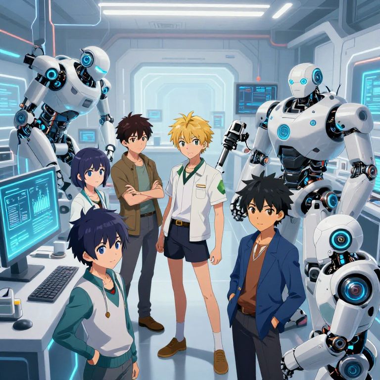 Anime photo ai scene, a group of diverse anime characters collaborating with AI robots in a high-tech lab, intricate details on both characters and machines, glowing screens, sleek modern design, bright and lively color palette
