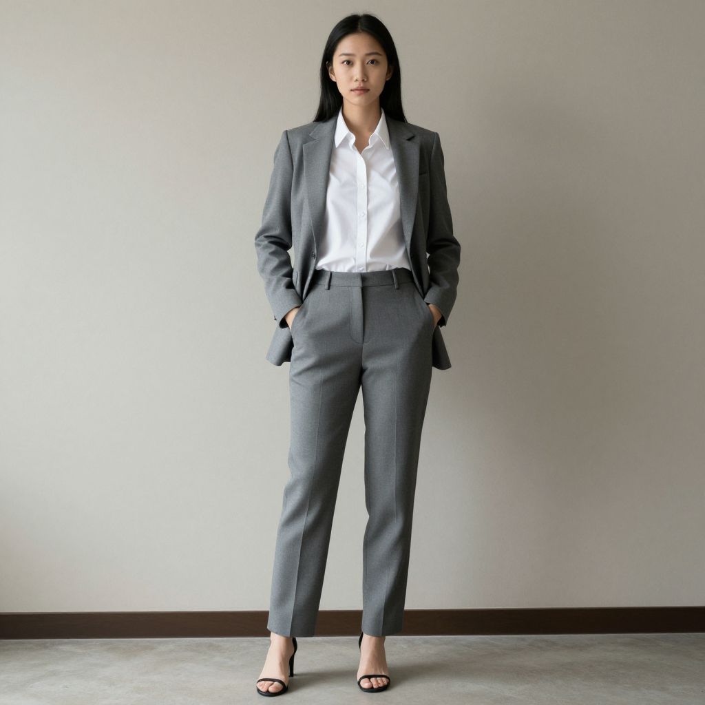 Photograph of an East Asian woman standing against a plain, light gray wall. She has straight, black hair that falls to her shoulders and is wearing a tailored, gray business suit with a white button-up shirt underneath. Her hands are in her pants pockets, and she is wearing black open-toe heels. The suit is well-fitted, emphasizing her slim build. The floor is gray concrete, and the background is minimalistic, drawing attention to her professional attire and confident stance. The overall composition is modern and sleek.