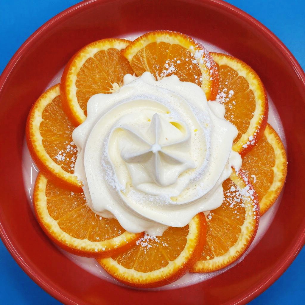 This is a vivid, close-up photograph of a dessert. The dessert features a spiral pattern of sliced orange fruits and creamy white whipped topping, dusted with a light layer of powdered sugar. It's arranged in a bright red, glossy bowl with a blue background at the edges. The colors are bold and the textures are contrasting, with the smooth whipped topping and crunchy fruit slices.