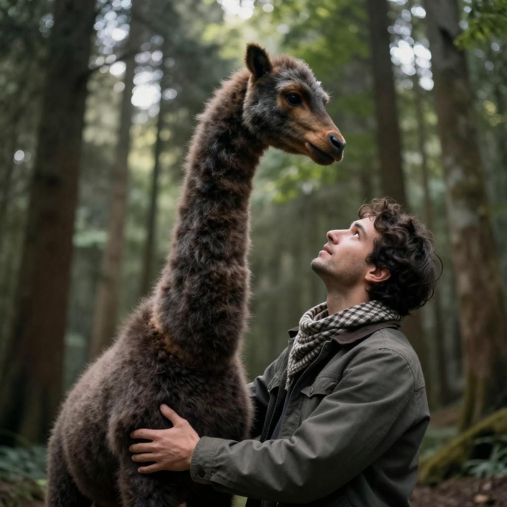 A photograph of a man with brown hair and a beard, wearing a dark shirt and beige pants, sitting on grass, holding a black-and-white ring-tailed lemur on his lap. Another lemur stands in front of him, looking up. The background features green trees and a clear sky.