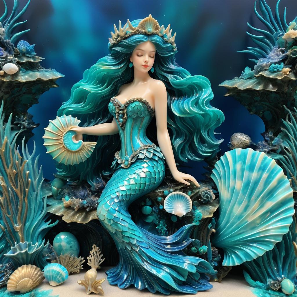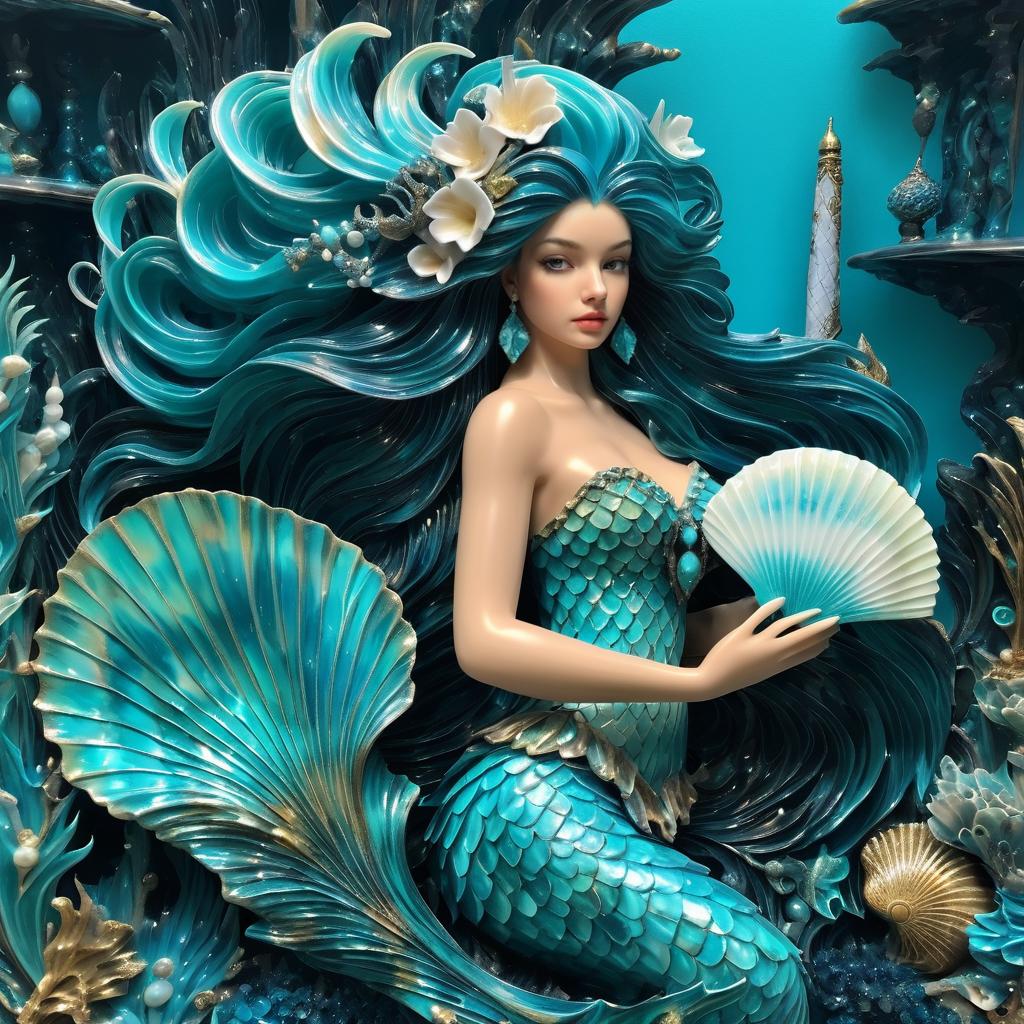 Beautiful mermaid with turquoise fins holding a seashell, set in a dark fantasy world. Styled in high detail by Claude Monet.