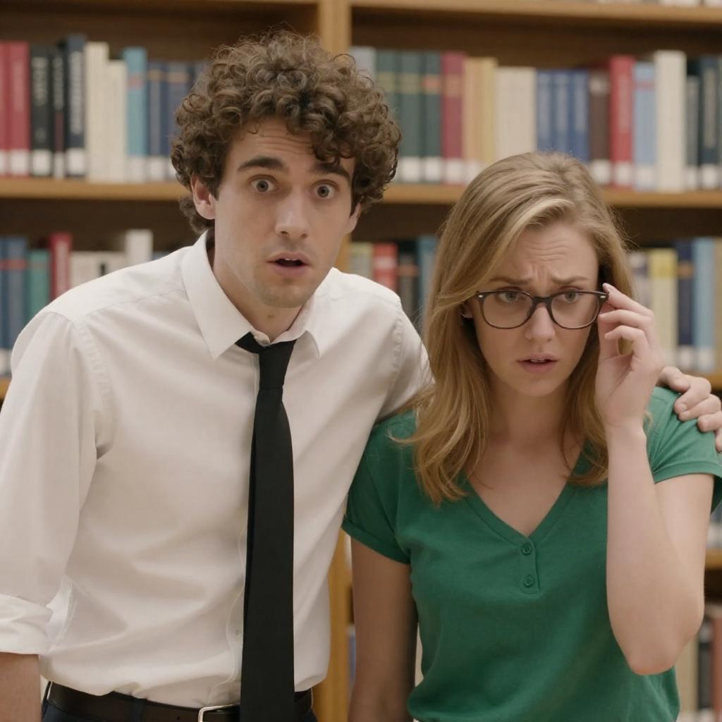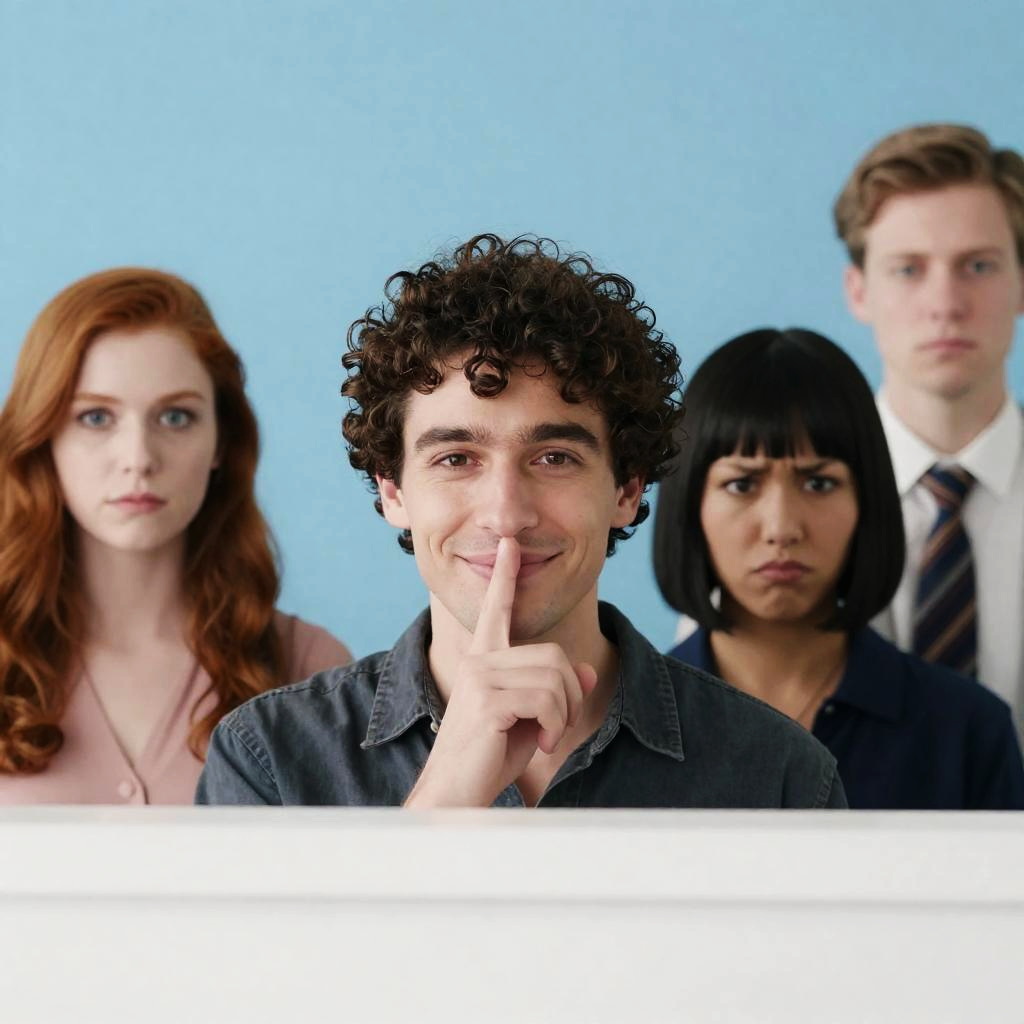 Portrait of four diverse young adults against a blue background. Central man with dark curly hair, wearing a dark shirt, smiles while holding a finger to his lips. To the left, a red-haired woman in a pink top has a neutral expression. To the right, a woman with a black bob and dark clothing looks slightly frowning. Further right, a man with light hair wears a white shirt and striped tie with a focused expression. White framed object in foreground.