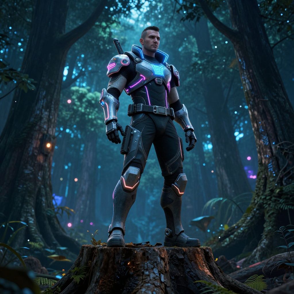 A cyberpunk 38-year-old man wearing neon armor stands on an ancient tree stump in a glowing forest at night.