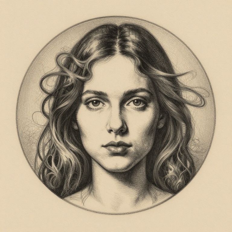 Sensor A bloc print style Ink drawing on sepia paper of a girls face abstracted into a circle with fractal hair around her. The Face should look like Astrid Berges-Frisbey.,