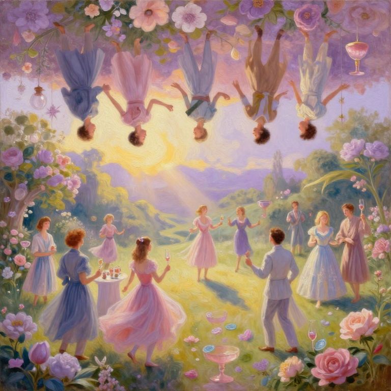 A whimsical oil painting captures an aerial view of an enchanting garden party in a surreal floating landscape where gravity is defied. Delicate pastel flowers bloom upside down on the ceiling as guests wear inverted attire and dance beneath them. Their laughter resonates through the airy atmosphere, creating a dreamlike ambiance. The vivid color palette features lavender skies and golden hour sunbeams that cast a warm glow upon this topsy-turvy world, where guests engage in playful conversations and sip from floating glasses.