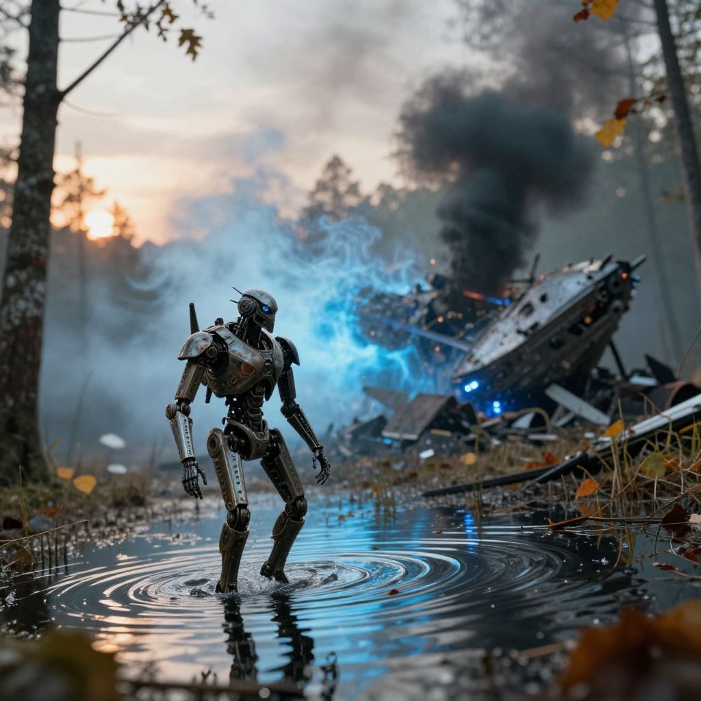 Photograph-style CGI image of a futuristic, humanoid robot standing in a shallow, reflective puddle in a forest. The robot, with metallic armor and a sword on its back, has a strong, muscular build and is surrounded by blue smoke and glowing blue lights from a destroyed, futuristic vehicle in the background. The forest is misty with tall trees, and the sky is an orange and white gradient, suggesting a sunrise or sunset. Water droplets and ripples are visible around the robot's feet, adding a dynamic element to the scene.