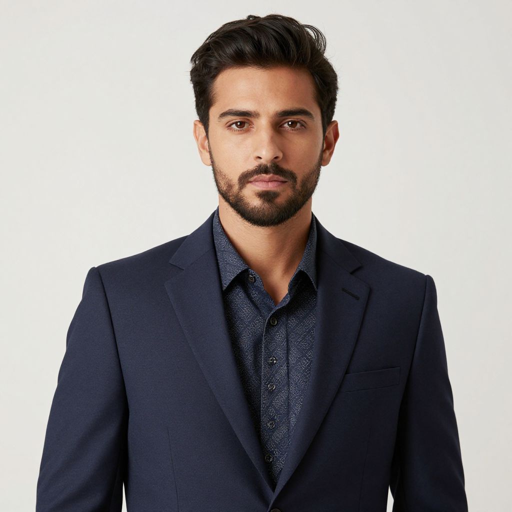 Photograph of a young man with medium brown skin and black, neatly styled hair and beard, looking directly at the camera. He wears a dark navy blue suit jacket over a matching textured button-up shirt. His expression is neutral with slightly parted lips. The background is completely white, making him the focal point. The image is well-lit with even lighting, highlighting his facial features and clothing. The style is modern and professional.