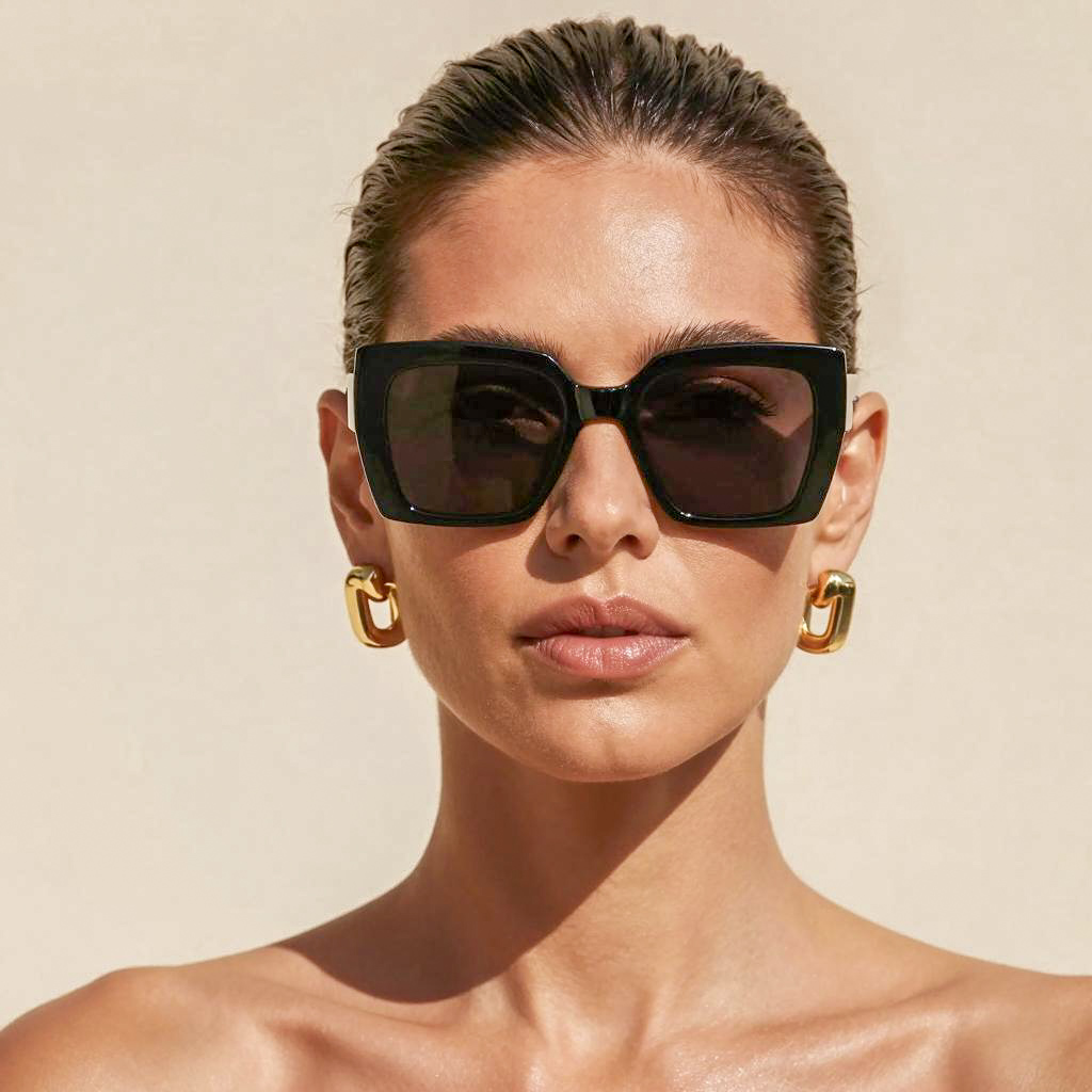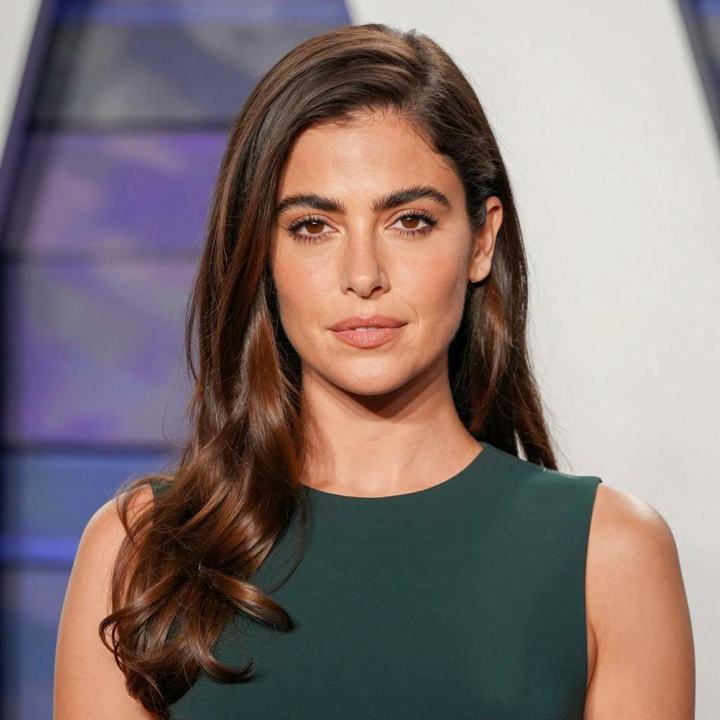 Photograph of a woman with medium skin tone, brown eyes, and dark brown hair. She has dark eyebrows, subtle makeup, and orange earrings. She wears a dark grey blazer with a V-neck. Her hair is slightly messy. She has a neutral expression. The background is dark with a light source on the right.
