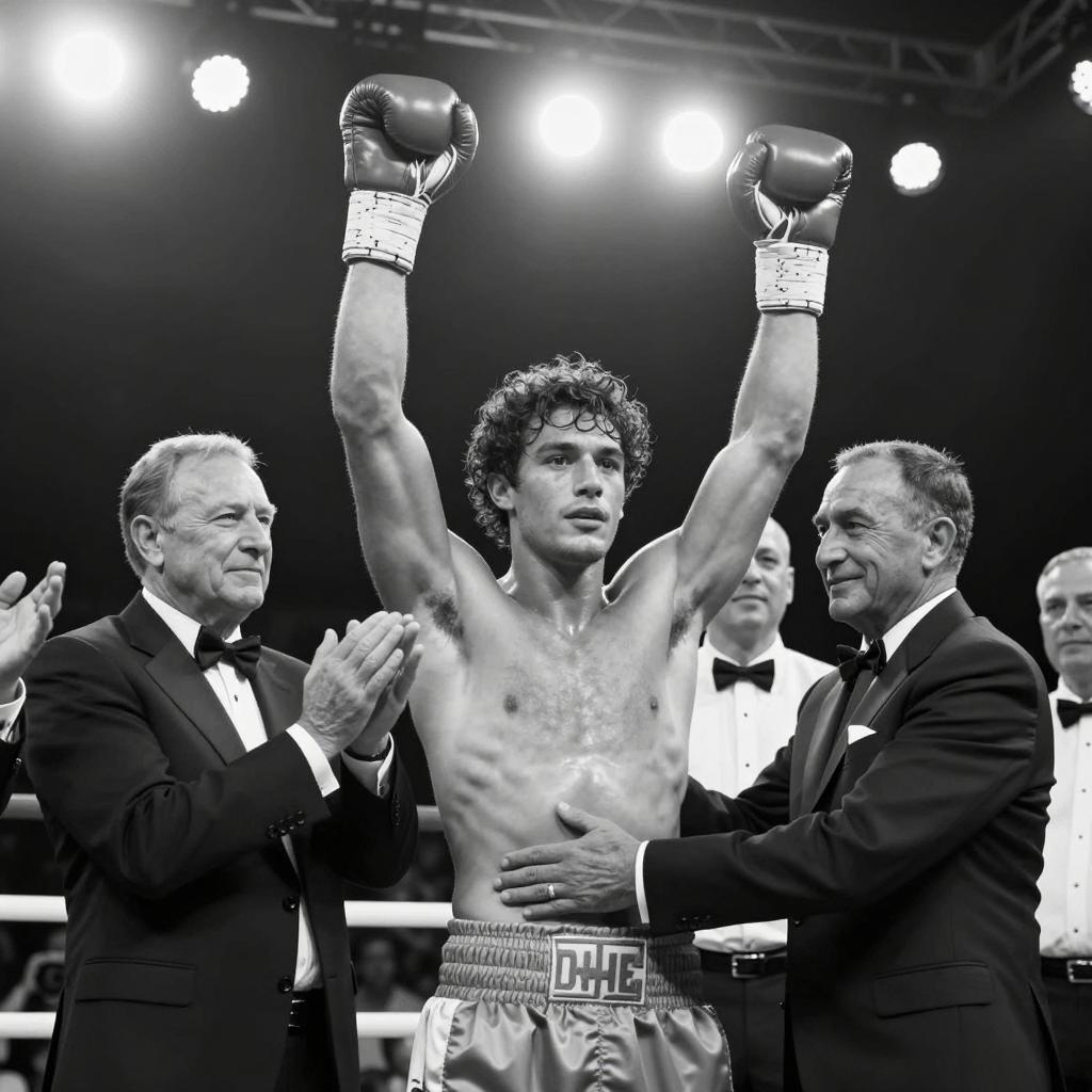 Muscular shirtless man with dark curly hair, wearing red boxing gloves and black shorts with a gold championship belt. Black background. Standing, looking forward, intense expression.
