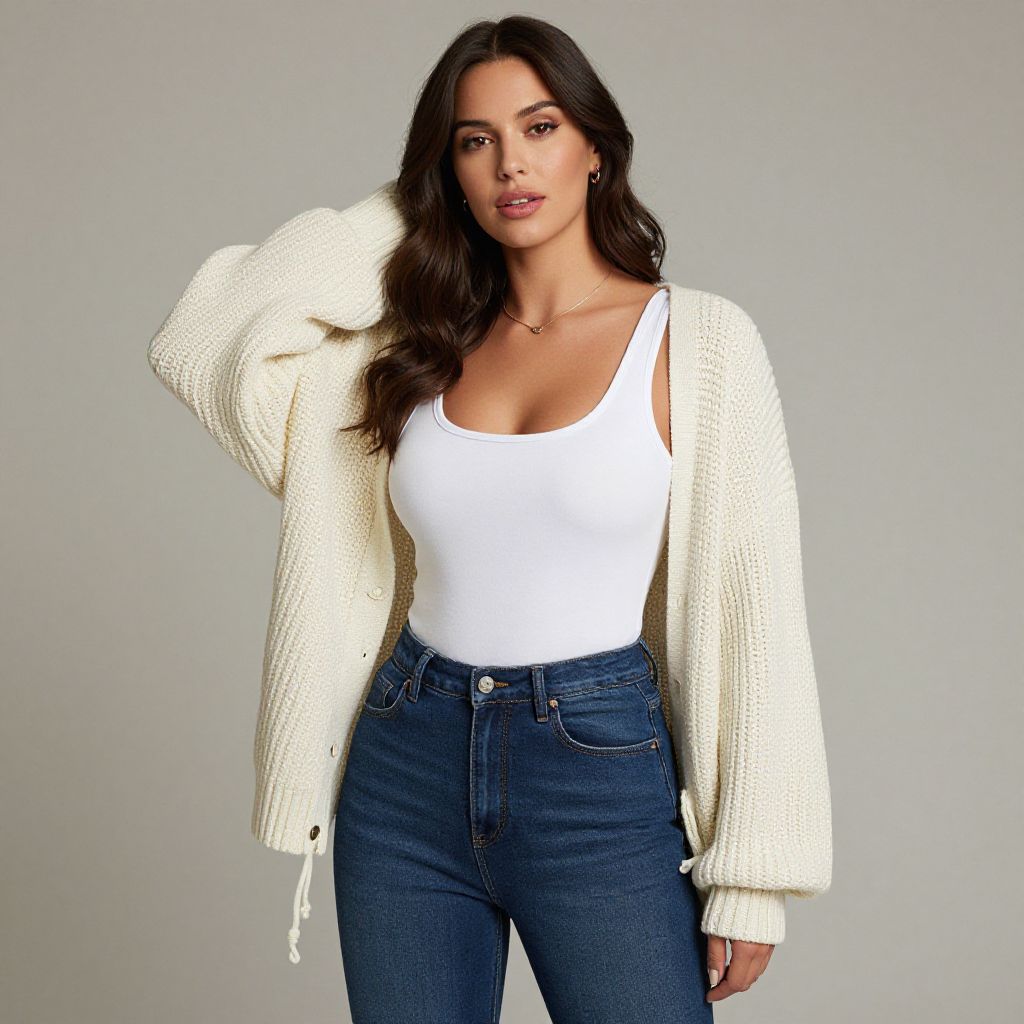 "Woman, casual chic, ivory chunky knit cardigan with wide sleeves and drawstring details, white scoop neck tank top, high-waisted skinny jeans in dark blue, solid color palette, studio background. Sexy. Pretty face and beаutiful eyes. Big breasts."