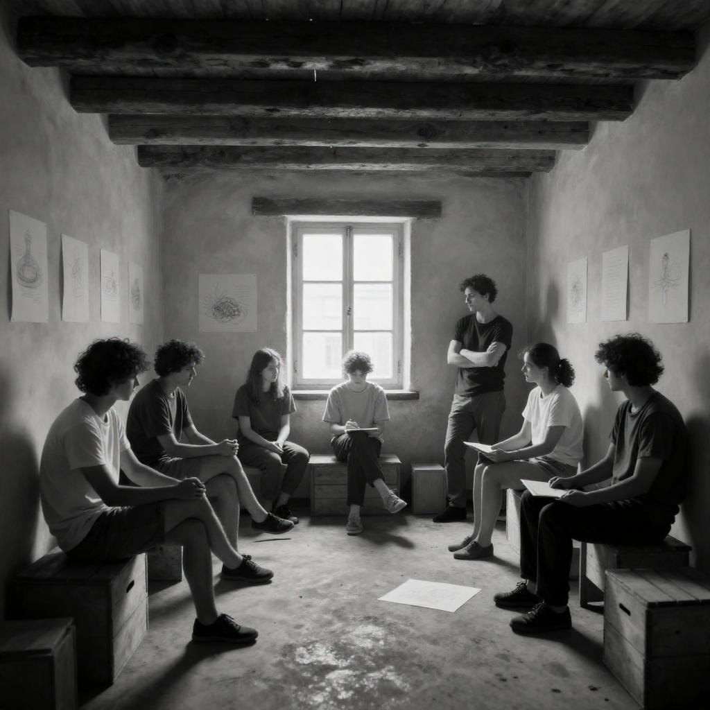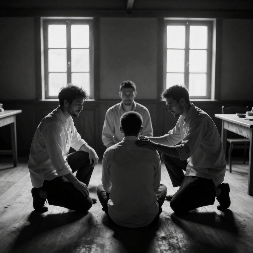 Black-and-white photograph of five men in a dimly lit, wooden room with two bright windows. They sit and kneel around a central figure, who is being tended to. The men wear loose, long-sleeved shirts and pants. Sunlight streams through the windows, casting strong shadows. A table is partially visible on the right.