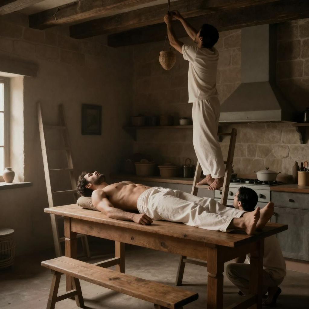 Dim Sunlit Room, Men Tending Figure
