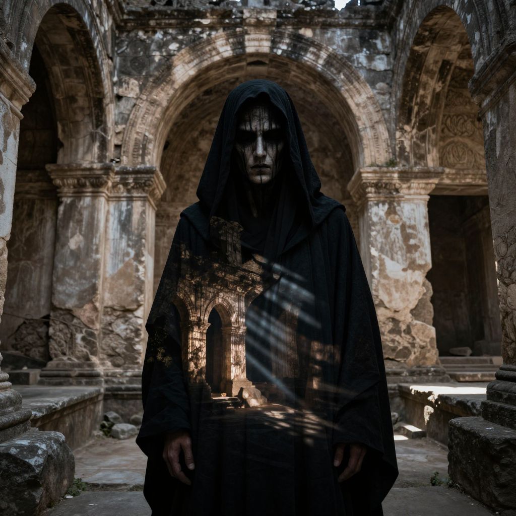 Photograph of a hooded figure in dark robes standing in a dilapidated, sunlit ancient archway, with shadows creating a mysterious, eerie