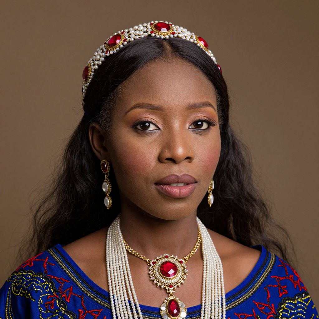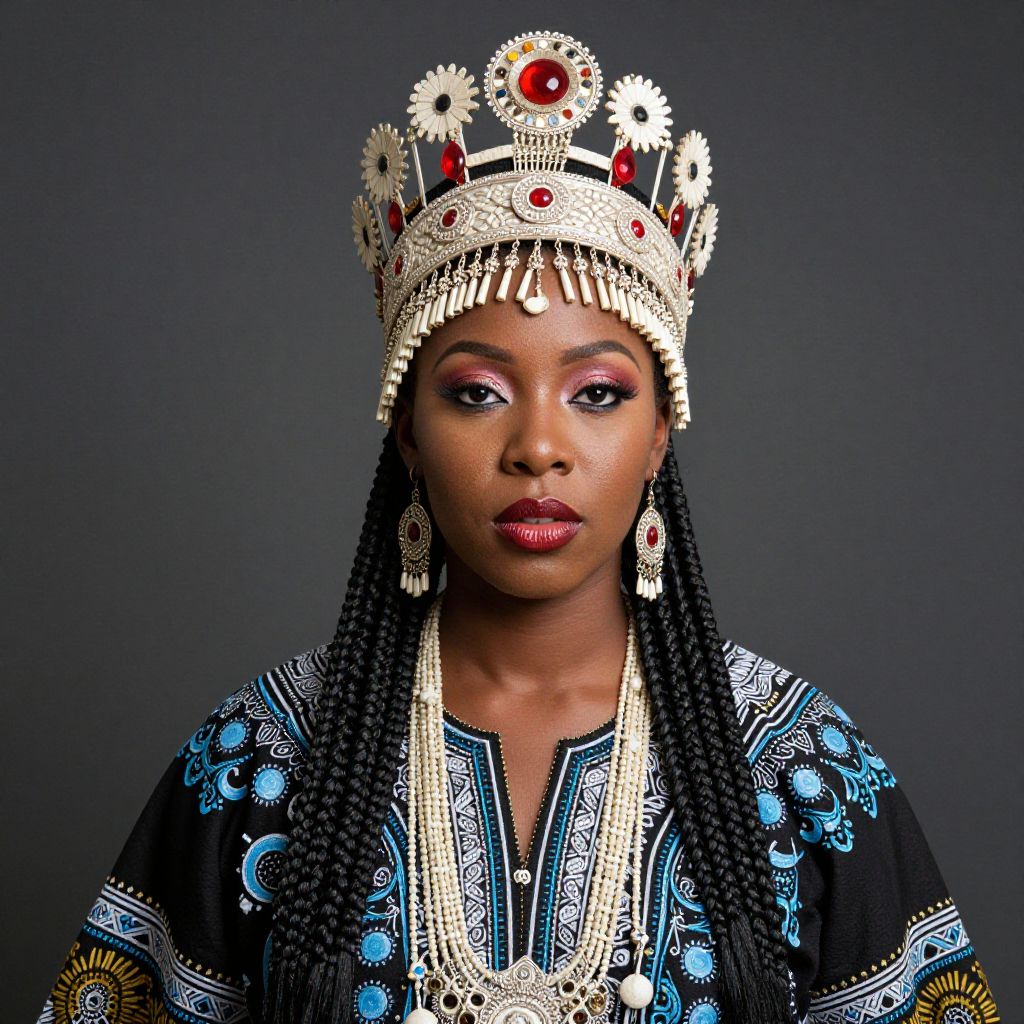 African american woman wearing a traditional outfit with a headdress and accessories.