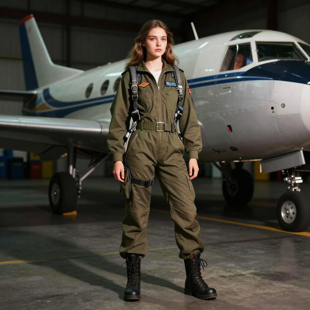 Photograph of a young woman standing in front of a small white and blue propeller airplane inside a dimly lit hangar. She has long brown hair, fair skin, and wears an olive green aviator jumpsuit with black lace-up boots, a black harness, and several patches on her chest. The airplane's nose and part of the wing are visible behind her. The hangar's concrete floor and metal walls are faintly visible in the background, with shadows adding depth to the scene. The lighting highlights her figure and the aircraft, creating a contrast between her and the darker background.