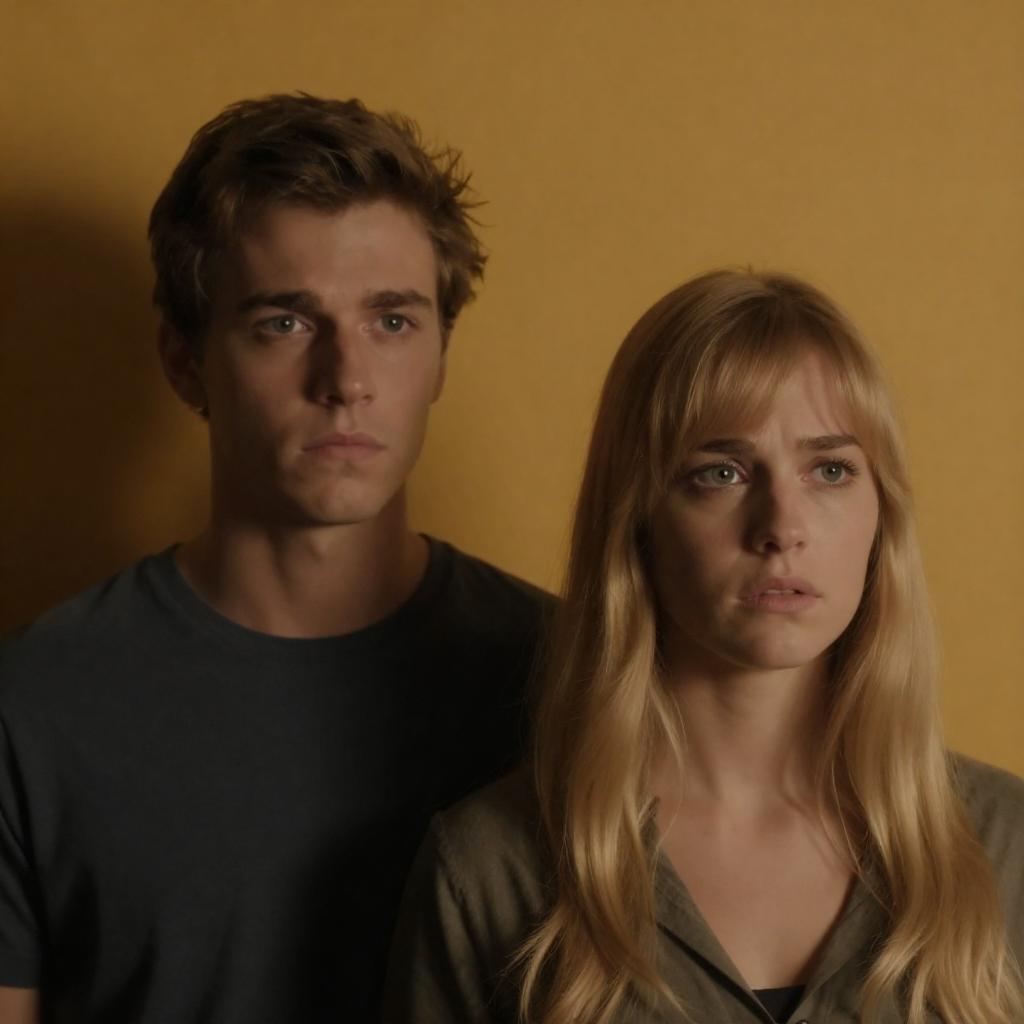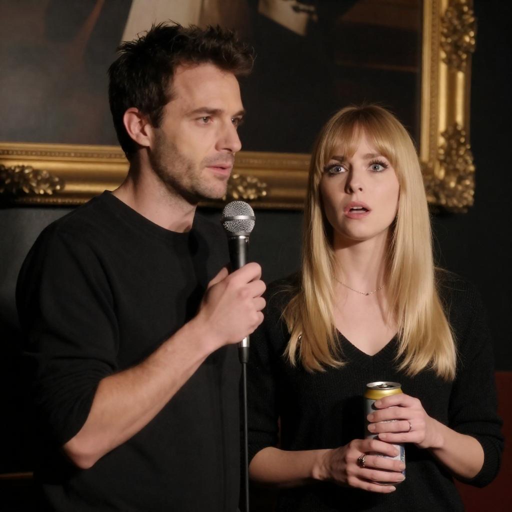 Photograph of a man with short dark hair and a serious expression, holding a microphone to a surprised woman with straight blonde hair and bangs, wearing a black V-neck sweater. She holds a can in her right hand. They stand in front of a dark, ornate wall with a gold-framed picture. The lighting is warm, creating a dramatic atmosphere.