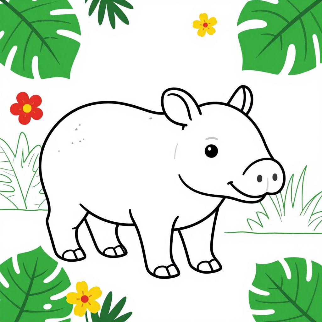 Tapir coloring page featuring a detailed outline of a friendly tapir in a jungle setting, surrounded by tropical leaves and flowers, designed for children to color with clear bold lines and playful elements.