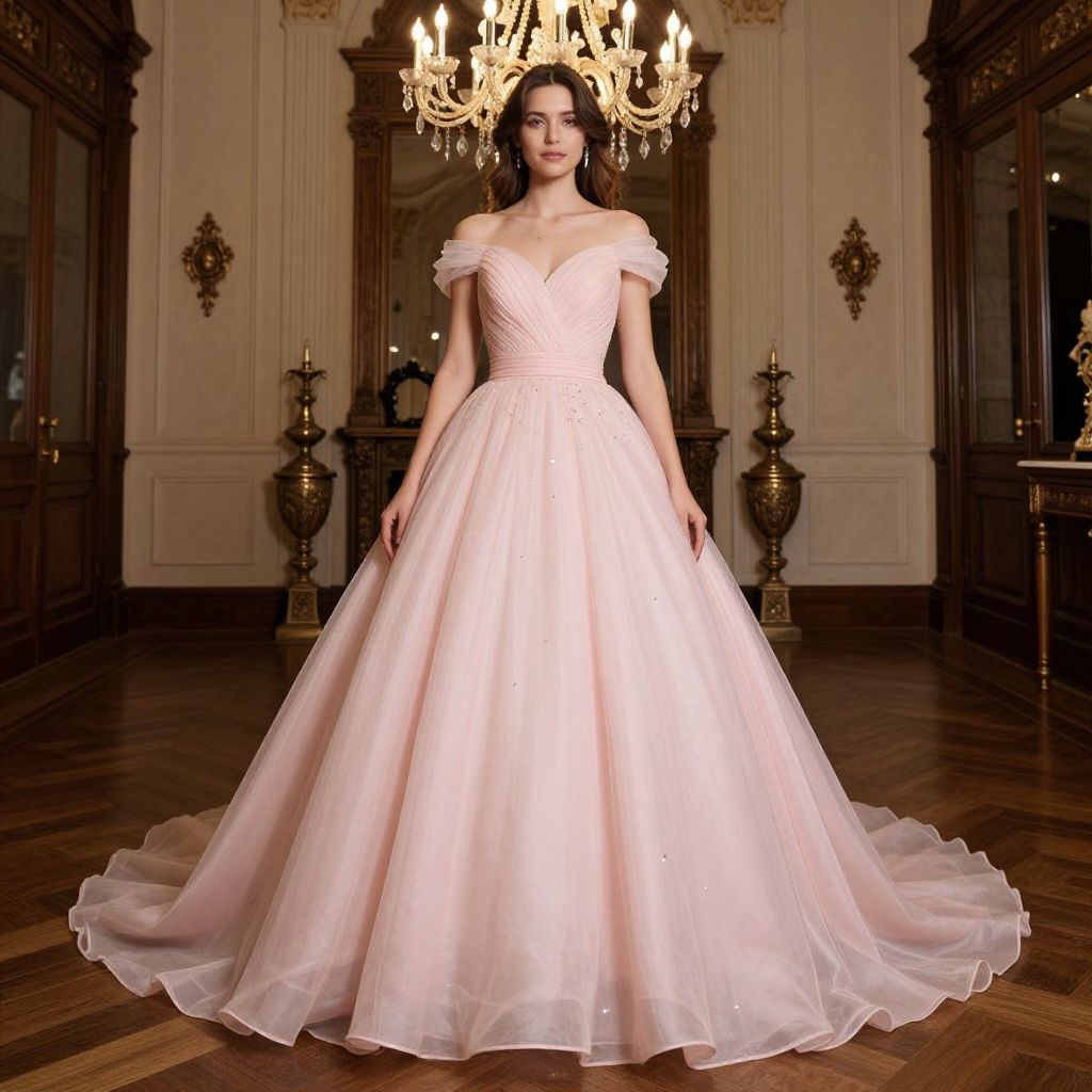Photograph of a young woman standing in an opulent, dimly lit room with wooden floors and ornate walls. She wears a pale pink, off-the-shoulder ball gown with a fitted bodice and a full, flowing skirt that cascades to the floor. The gown features delicate, sheer fabric and subtle sparkle. She has long, dark brown hair styled in soft waves. A grand chandelier hangs from the ceiling, casting a warm glow. Two brass candelabras are positioned symmetrically on either side of her in the background. The overall atmosphere is elegant and luxurious.
