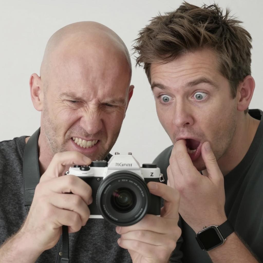 Two men, close-up, holding a white camera with a black "Z" . Bald man with clenched teeth, brown-haired man with wide eyes. Brown-haired man's left hand gripping camera, right hand near bald man's mouth. Both wearing dark clothing. Bright background.