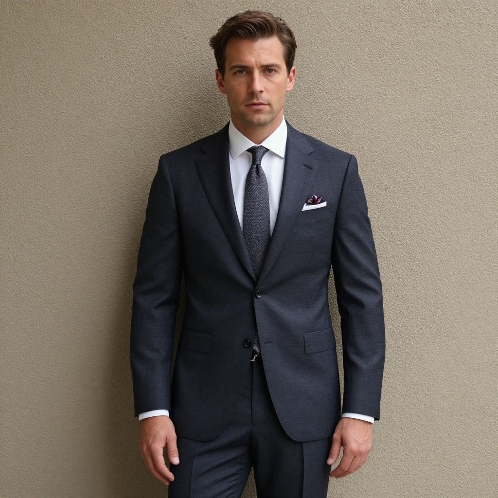 Photograph of a handsome, Caucasian man with short, dark brown hair and a clean-shaven face, standing against a textured, beige wall. He is wearing a dark navy blue, well-fitted, single-breasted suit with a white dress shirt and a black, patterned tie. A white pocket square is neatly tucked into his suit's left breast pocket. His expression is serious and slightly stern. The suit's fabric has a smooth, slightly shiny texture, and his posture is straight and confident, with his hands relaxed by his sides. The overall style is formal and professional.