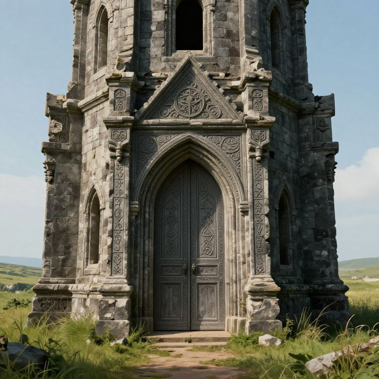 Photoshop the ruins of a once grand wizard tower surrounded by grasslands, the main double doors are closed with mystic runes all around the door frame, the doors are closed,