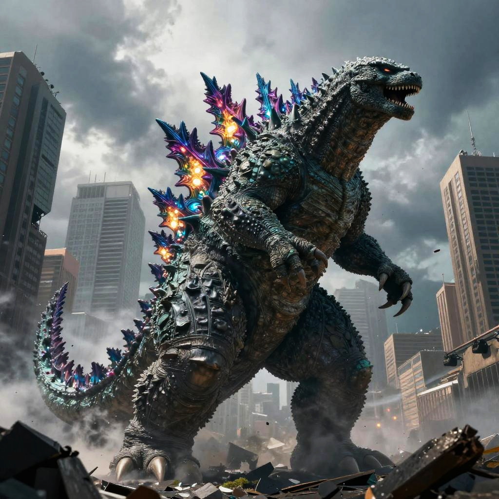 Digital artwork: Man in dark jacket and pants stands on rooftop, facing giant, roaring Godzilla destroying city skyline under dramatic clouds.