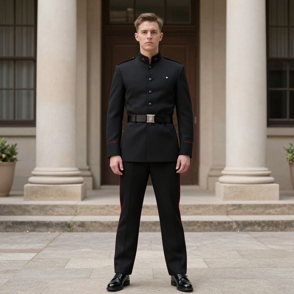 Photograph of a young Caucasian man standing in front of a classical building with tall white columns. He has short, light brown hair and a serious expression. He wears a black, military-style uniform with a high collar, buttoned up front, and a black belt with a silver buckle. His pants are black and match the uniform, and he has on black, polished dress shoes. The background includes a stone-paved ground and a dark wooden door. Potted plants are placed on either side of the door. The lighting is natural, highlighting the uniform's crisp texture.