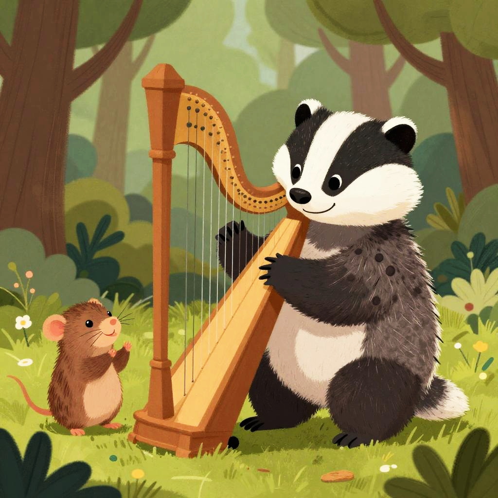 Badger playing the harp and mole clapping paws in a whimsical forest setting, playful and musical, illustrated in a charming style