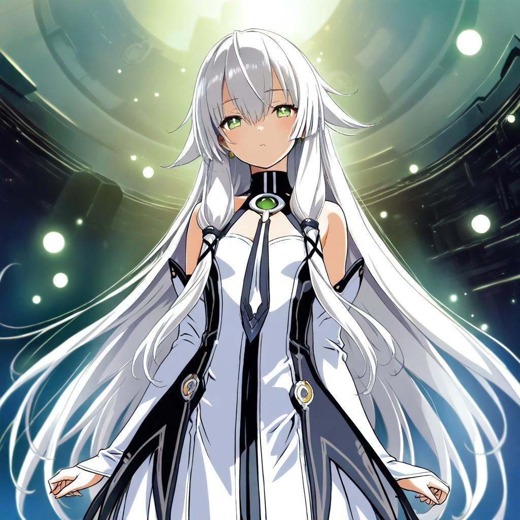 Illustration of a female anime character with very long white hair, green eyes, and sidelocks. She is dressed in a white and black futuristic outfit with long gloves, standing against a luminous, abstract sci-fi background.